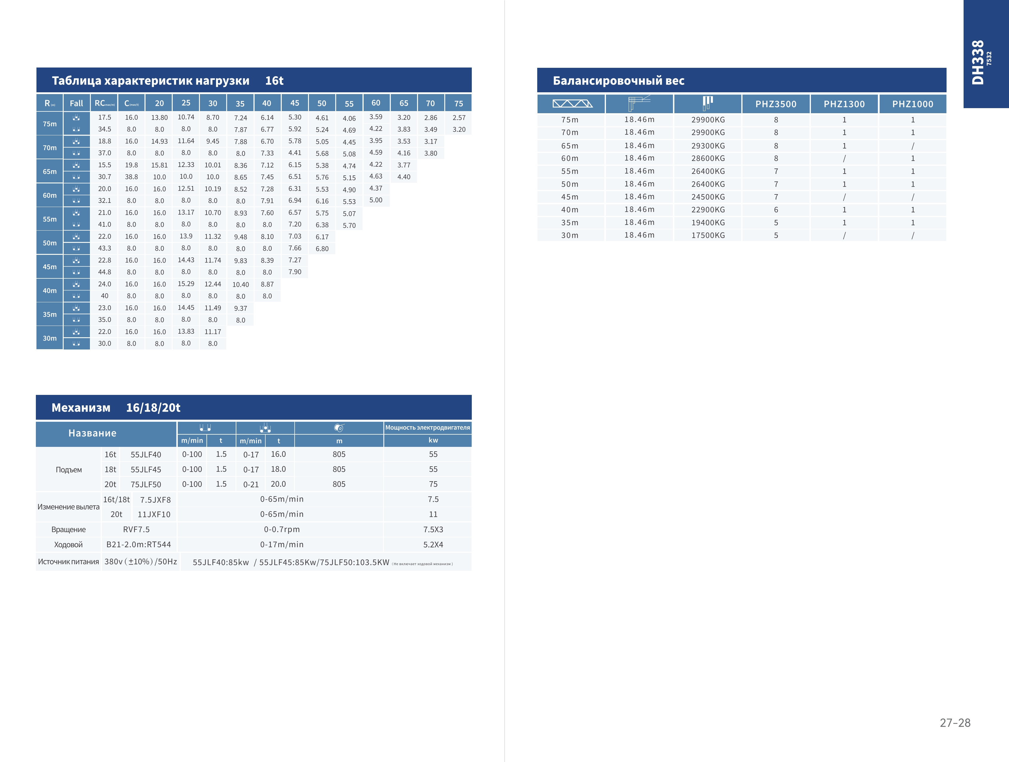 Грузоподъемность на конце стрелы 16т/18т/20т
